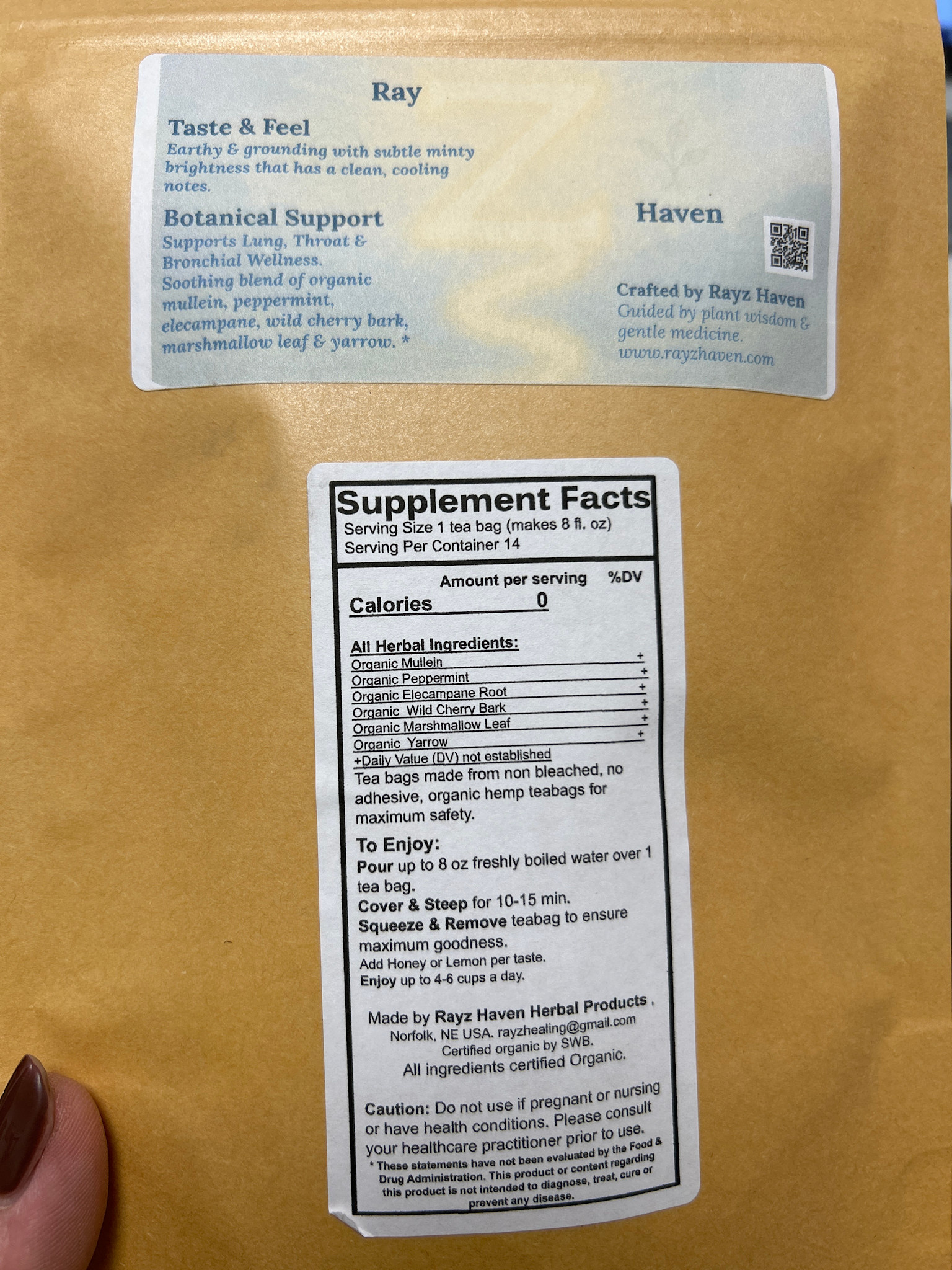 Ingredients: Mullen, peppermint, elecampane root, wild cherry bark, marshmallow leaf, and yarrow